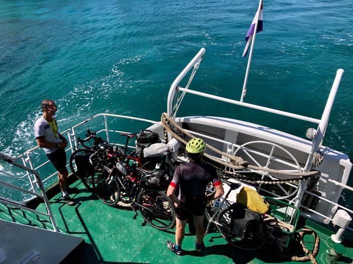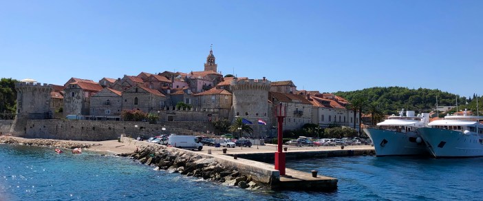 Après les 45 km de route sur l’île de Korcula, nous arrivons à la ville de Korcula où l’on prend un petit traversier pour regagner le continent.