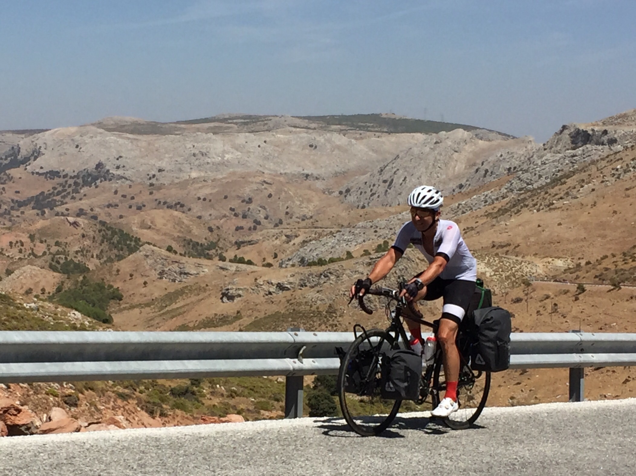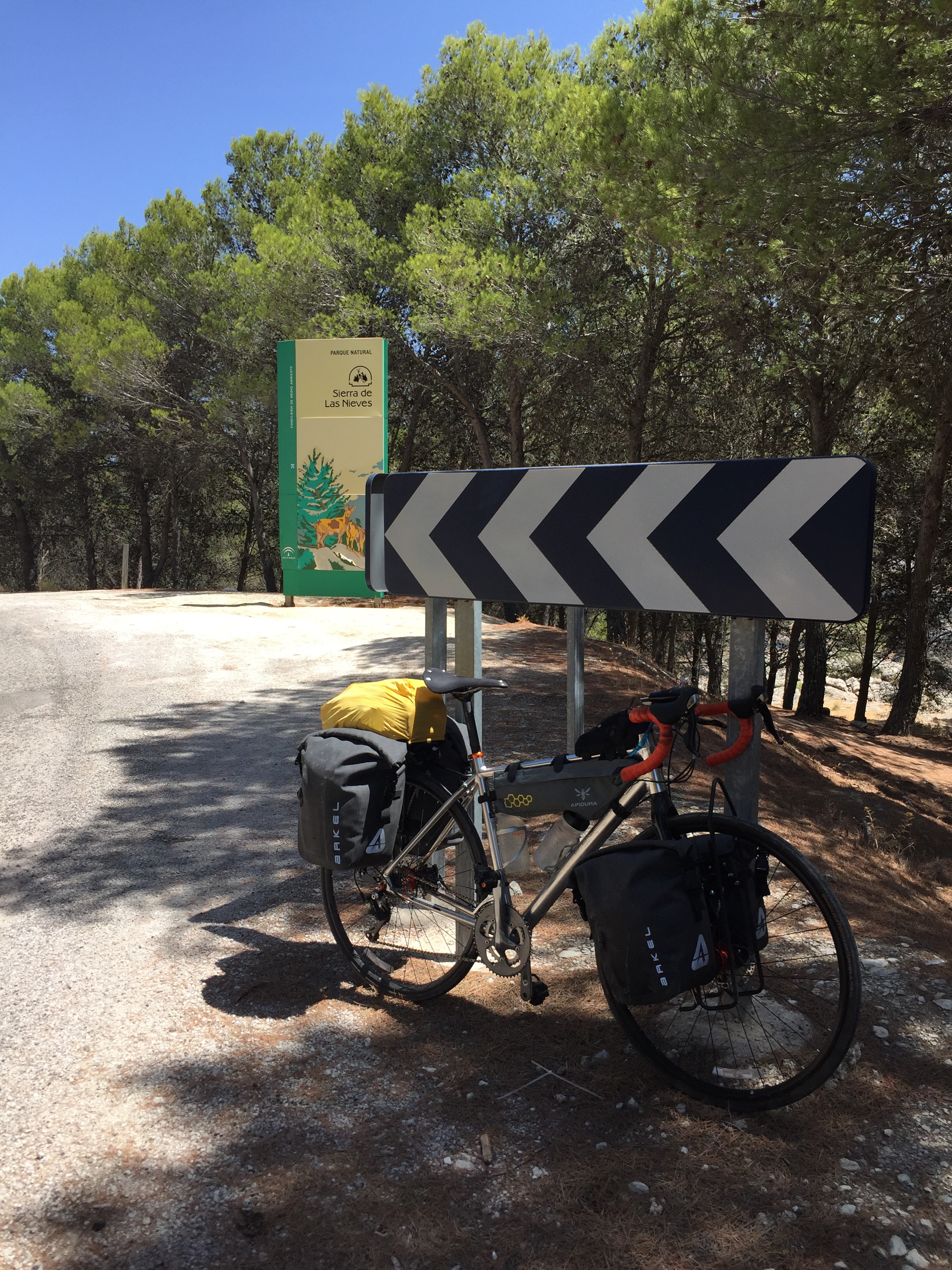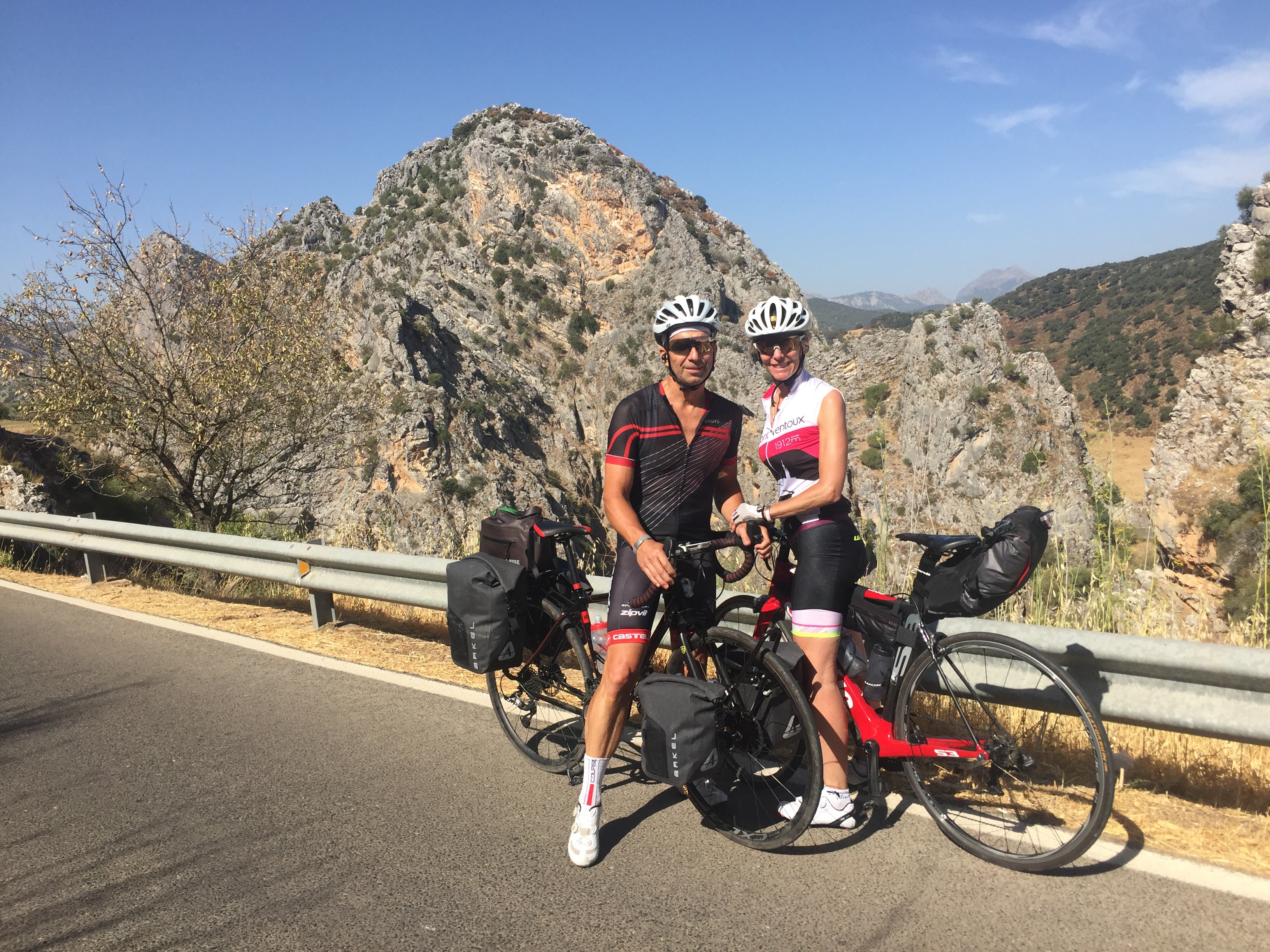 Constat: j’ai perdu une vis de mon support à baggages arrière. Durant les préparatifs du voyage, Bruno m’avait confirmé qu’il avait des vis de rechange alors je peux revisser le tout en moins de cinq minutes puis on prend le temps de s’informer auprès d’un citoyen local sur la voie à suivre puisque Google Maps s’entêtait à ne pas retracer un nouveau chemin vers Grazalema.