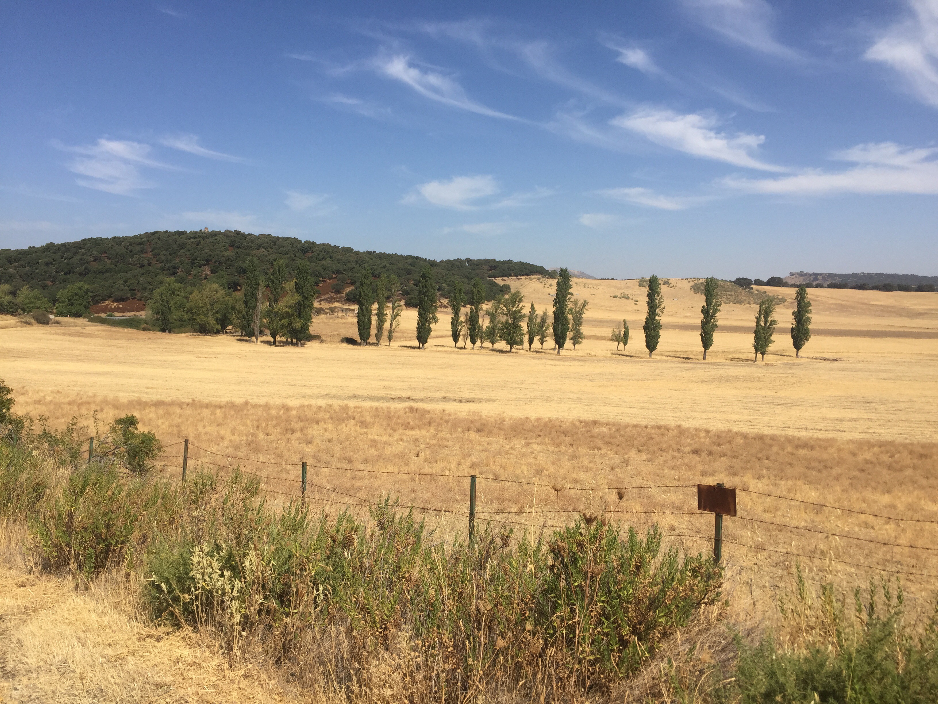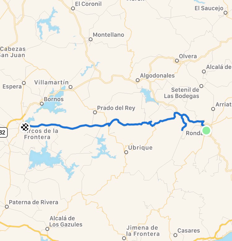 Le reste du chemin est assez roulant et à 10 km d’Arcos de Frontera, ma blonde, sentant l’hyperthermie l’envahir, demande à faire une pause.
