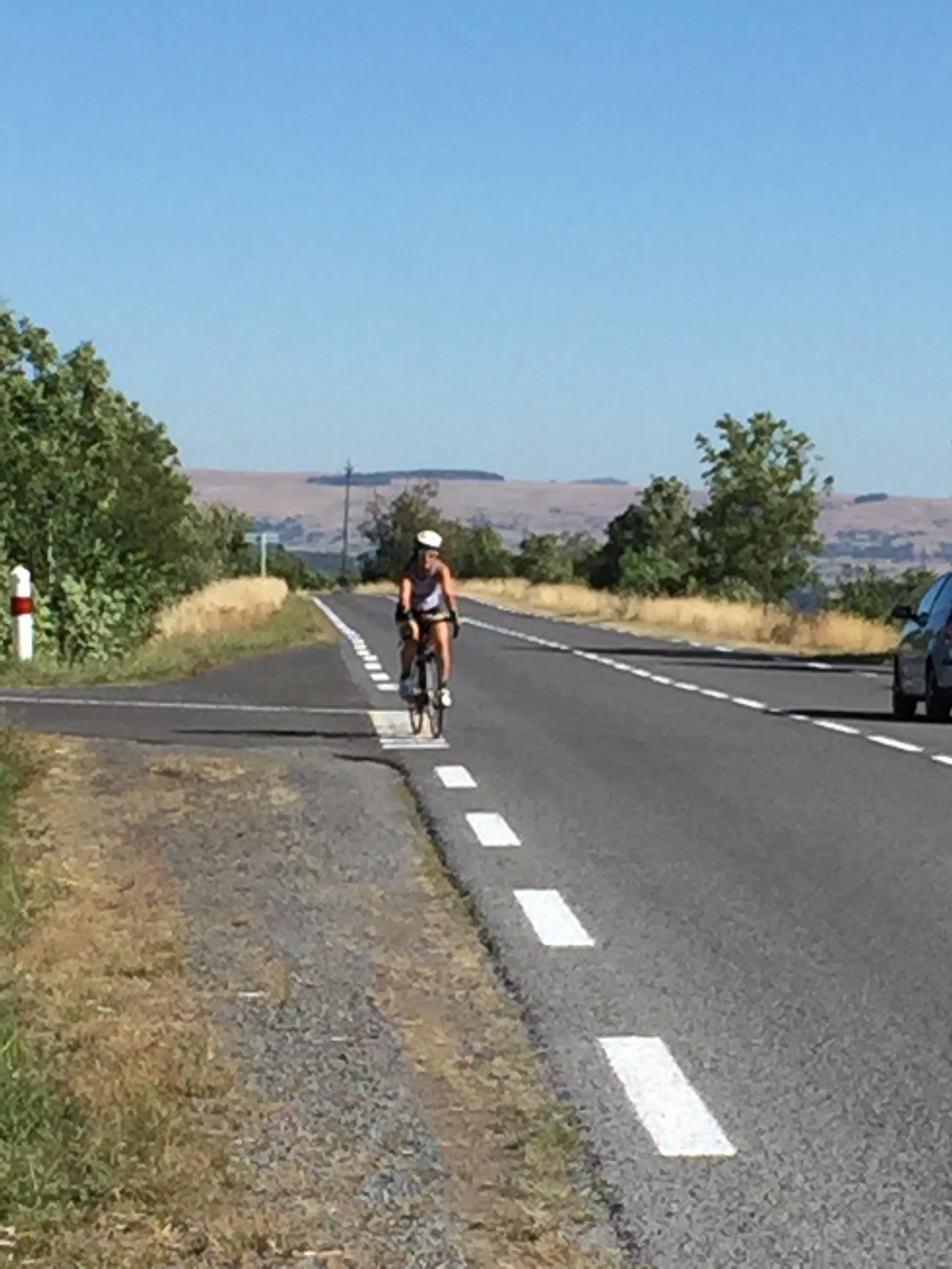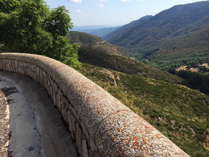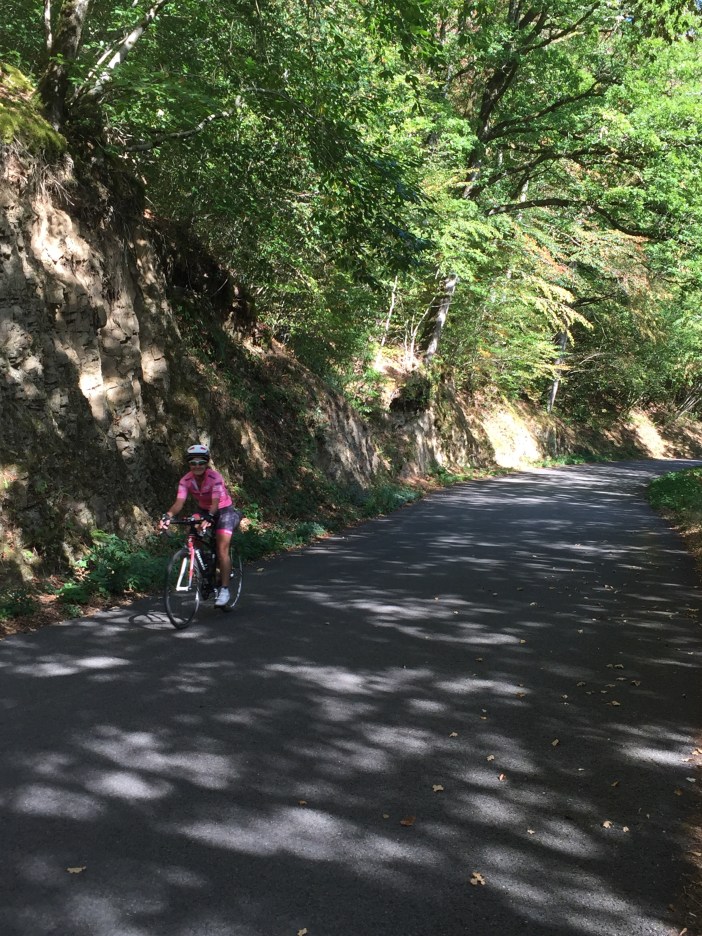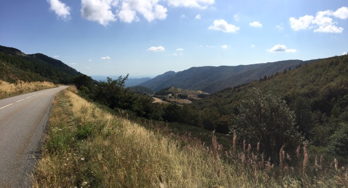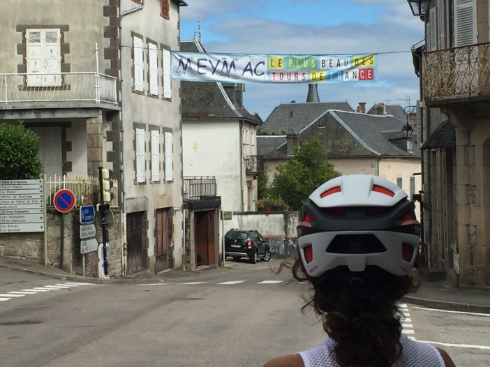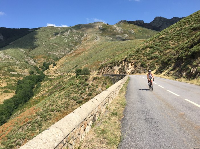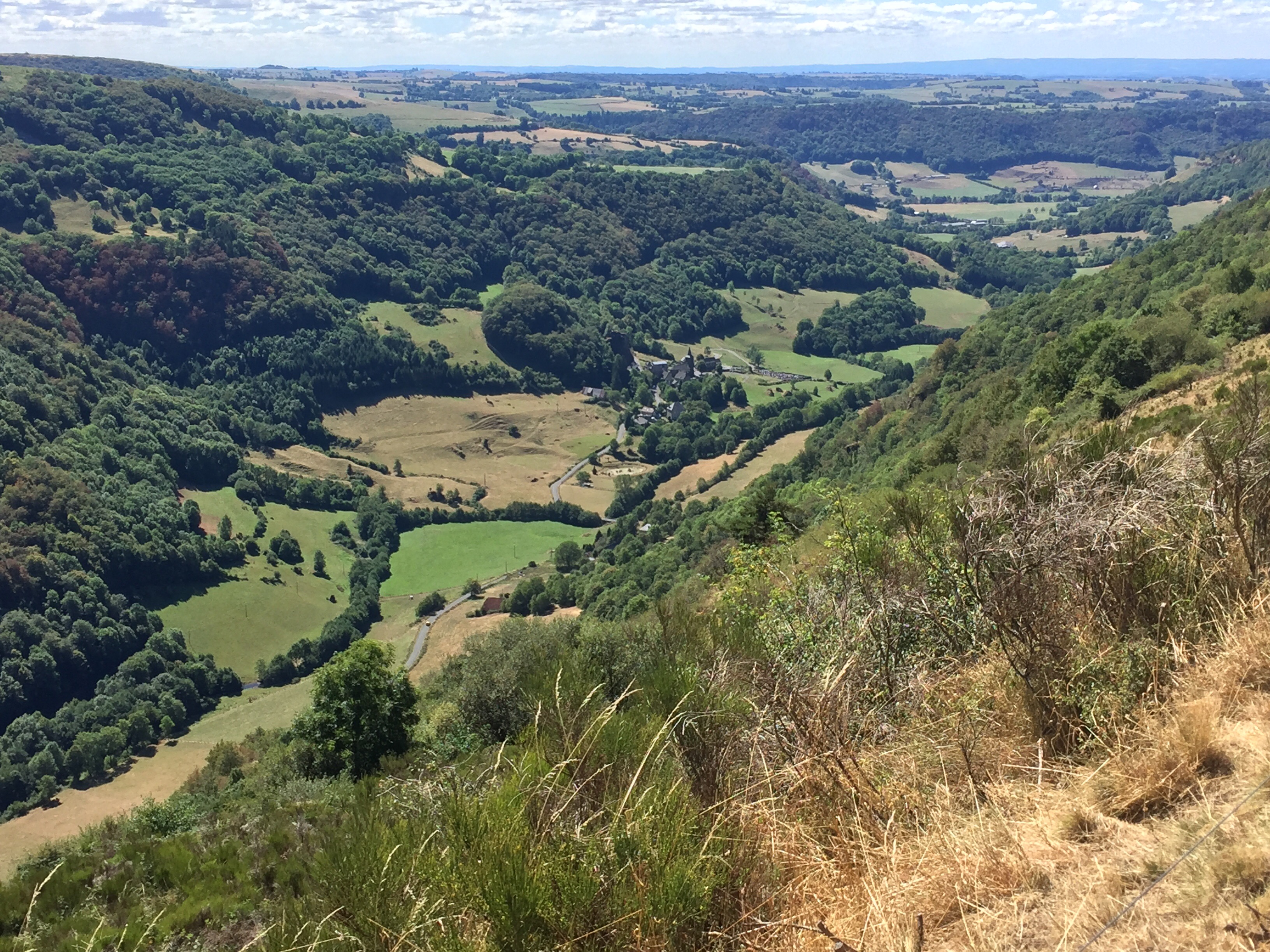 Après Salers, on grimpe longtemps, avec un pourcentage d’environ 3 à 4%, mais avec un vent de face, sur un route étroite avec pavé refait pour le TDF. On roule à 1000 mètres d’altitude vers le col de Néronne avec une énorme vallée à notre droite. À couper le souffle!