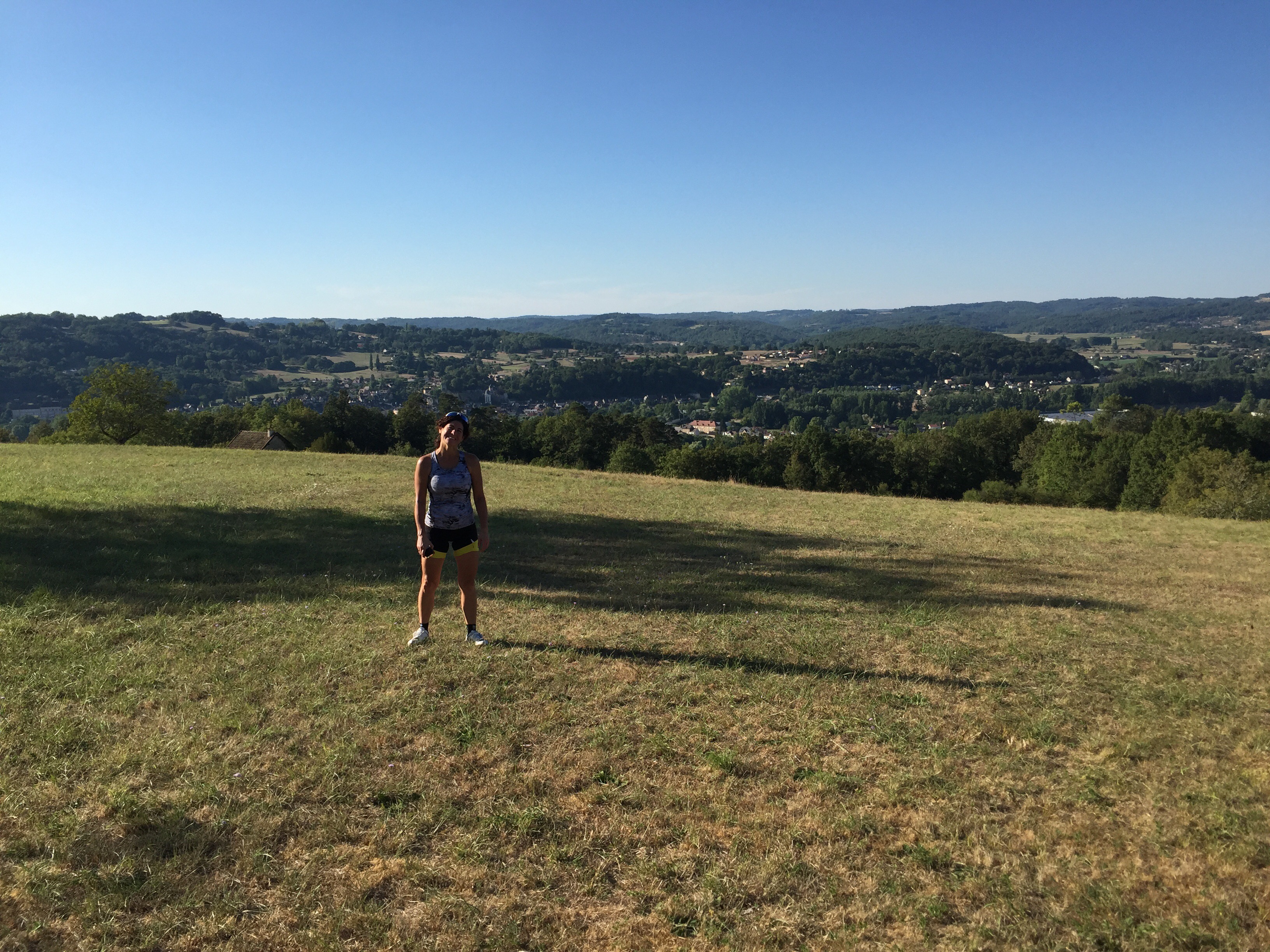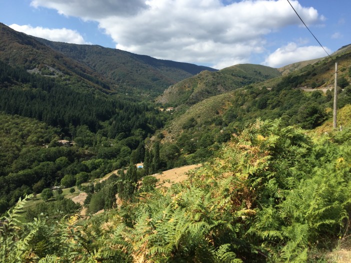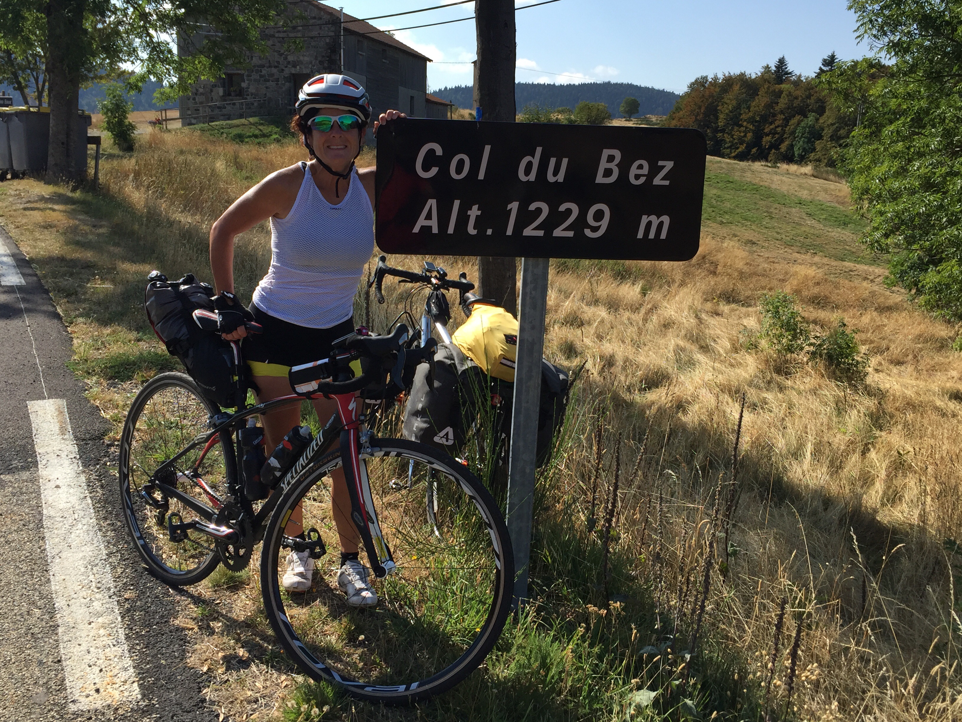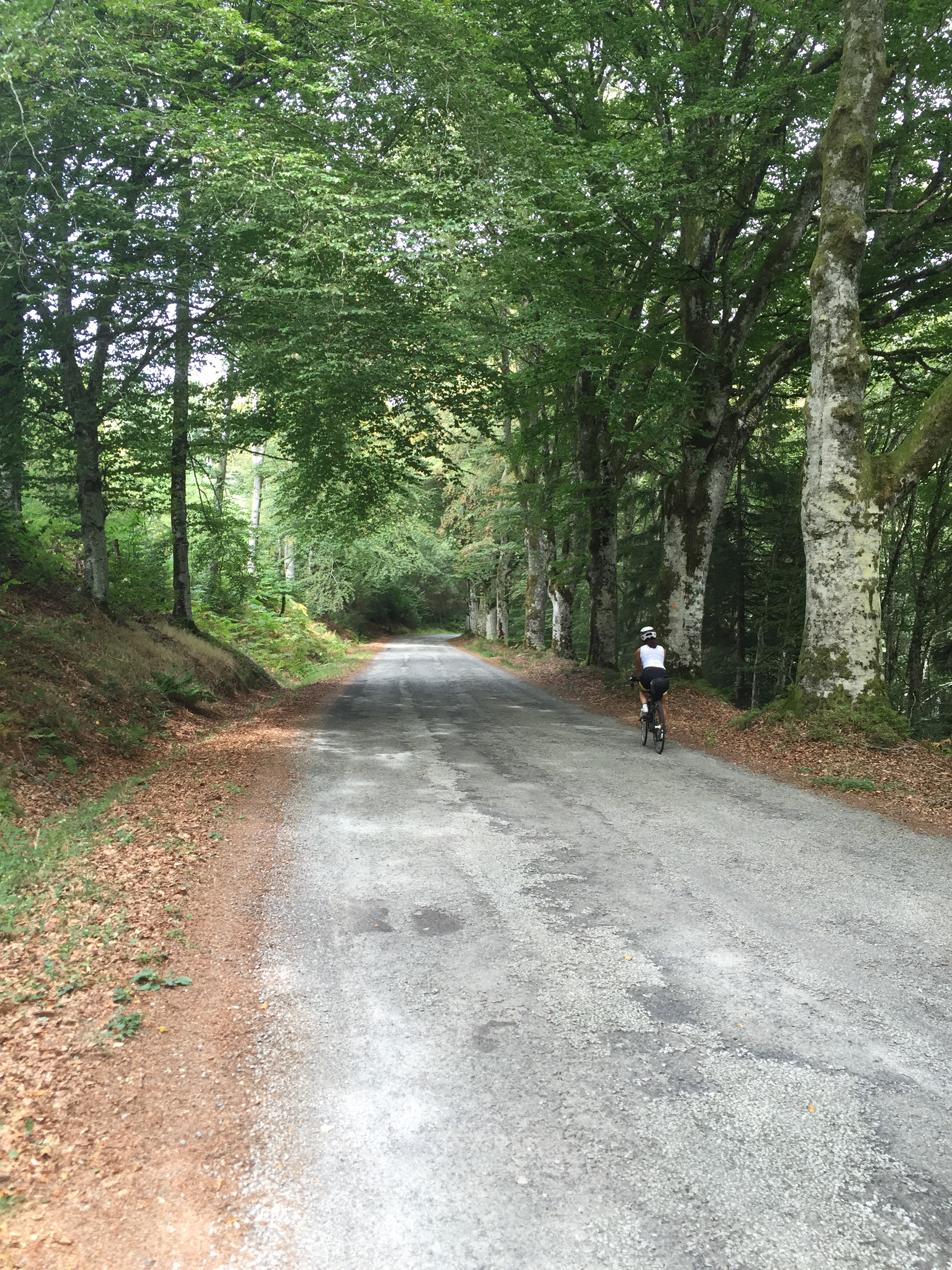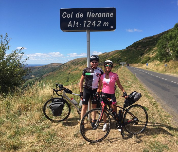 Après Salers, on grimpe longtemps, avec un pourcentage d’environ 3 à 4%, mais avec un vent de face, sur un route étroite avec pavé refait pour le TDF. On roule à 1000 mètres d’altitude vers le col de Néronne avec une énorme vallée à notre droite. À couper le souffle!