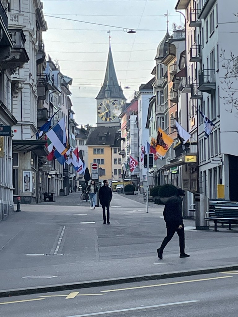 On trouve un café avec viennoiseries. Une dame un peu bourrue, à peine compréhensible derrière son masque de coton inutile finit par achever nos commandes puis nous pouvons profiter de lattes et croissants au soleil. Sauf pour les filles qui décident de s’attaquer à des sandwichs aux oeufs.