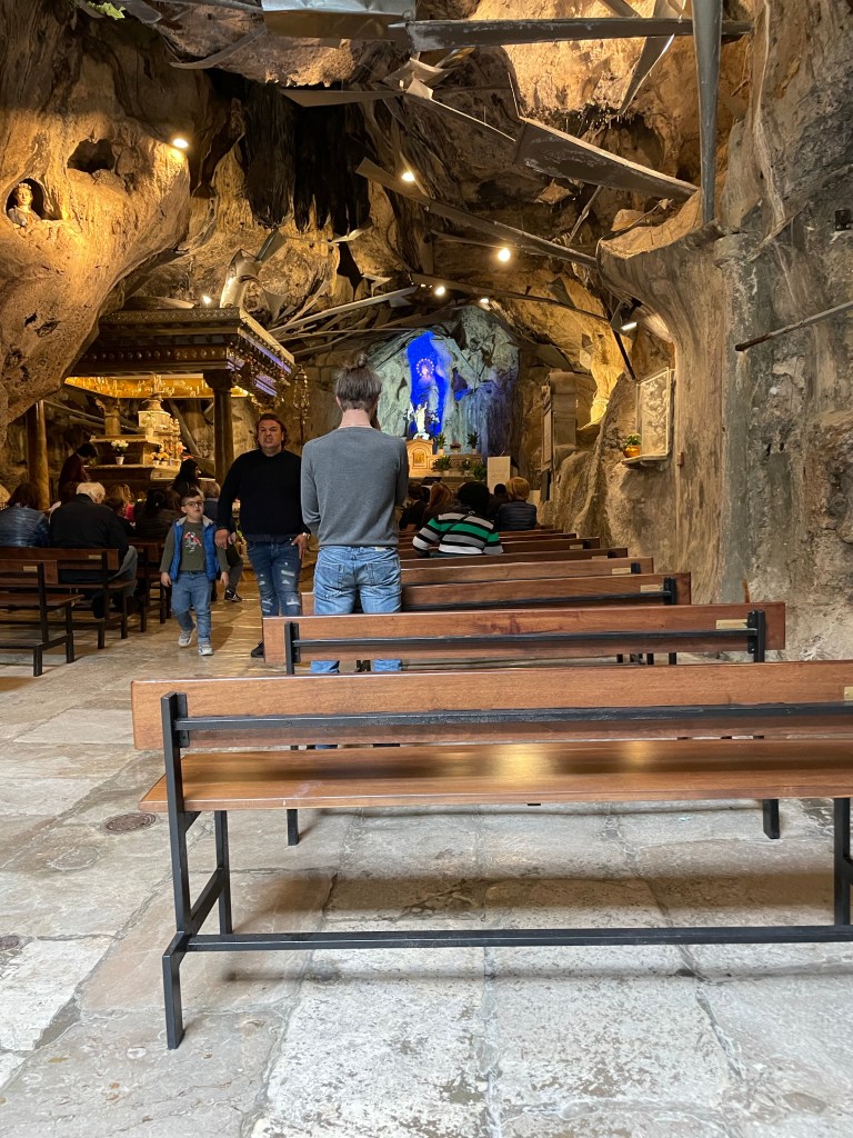 À l’intérieur, le plafond de la grotte est parsemé de gouttières en zinc qui recueille l’eau suintant de la roche. Cette eau est supposée faire des miracles…
