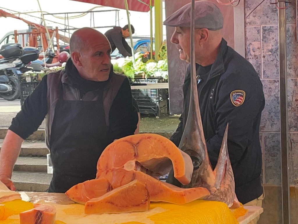 Et ce fut pour notre bonheur. Il faut qu’il parcoure le marché del Capo tous les jours alors, il y connait tout le monde. De plus, comme il ne veut pas préparer le même repas tous les jours, il doit faire affaire avec différents vendeurs alors il semble être chez lui dans ce marché.