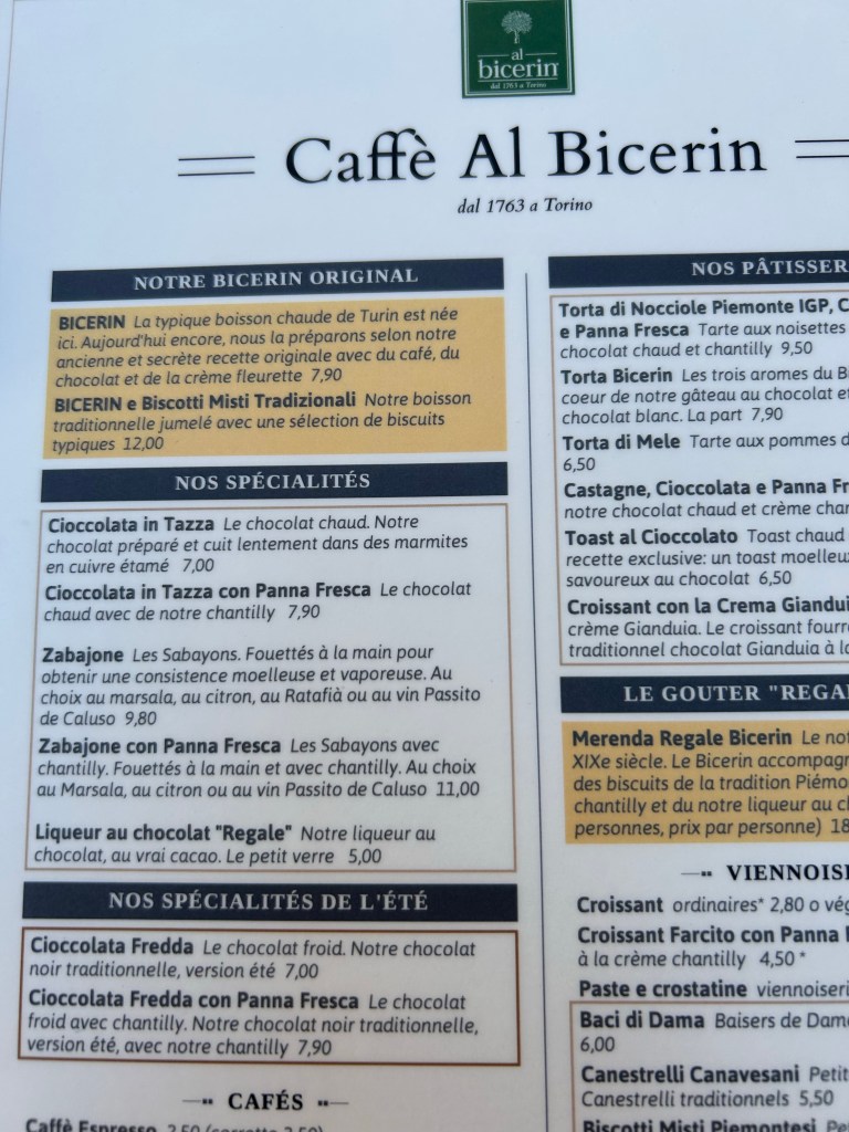 Par la suite, pour égayer cette belle journée ensoleillée, on retourne au centre ville de Turin pour y savourer un café Bicerin.
