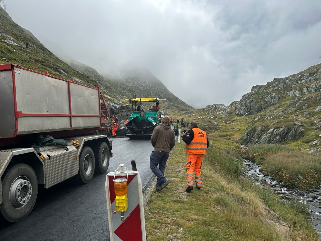 Toutefois, entre temps nous rencontrons deux cyclistes descendant du col et ceux-ci nous rassurent puisqu’ils arrivent du côté suisse. Ils confirment qu’il y a de la construction sur la route mais on peut passer à pied, à côté de la route en réfection.