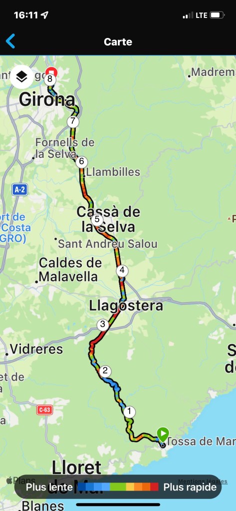 Par la suite, rien de brillant à vous raconter sauf pour l’entrée à Tossa de Mar qui incluait une belle ascension style mini-col avec une pointe de pente à 17%.