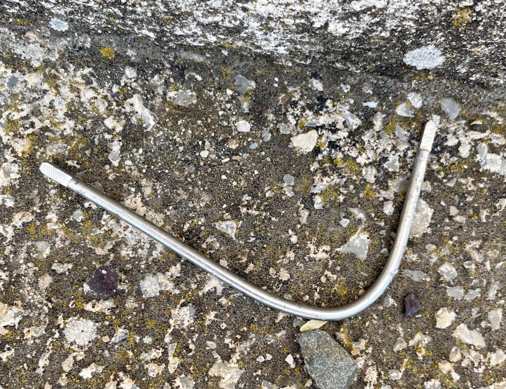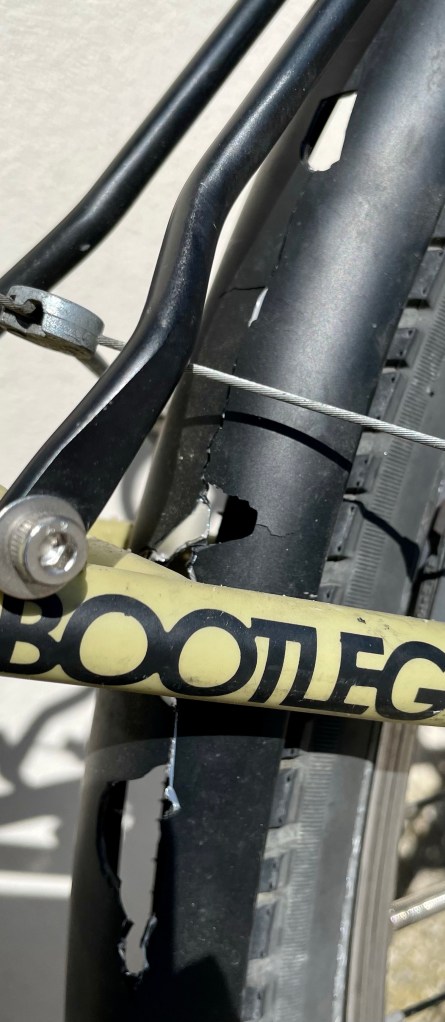 Pour couronner le tout, une broche de métal courbée pénètre mon pneu arrière à deux endroit et en ressortant comme une protubérance du pneu, elle vient déchirer mon garde-boue arrière.