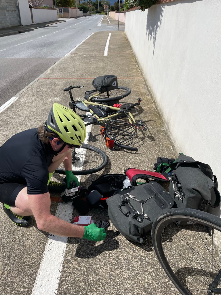 Les trous dans le pneu étaient tels que la chambre à air y faisait protrusion et une lente fuite d’air m’a obliger d’arrêter pour y remettre de l’air à environ 5 km de Narbonne.
