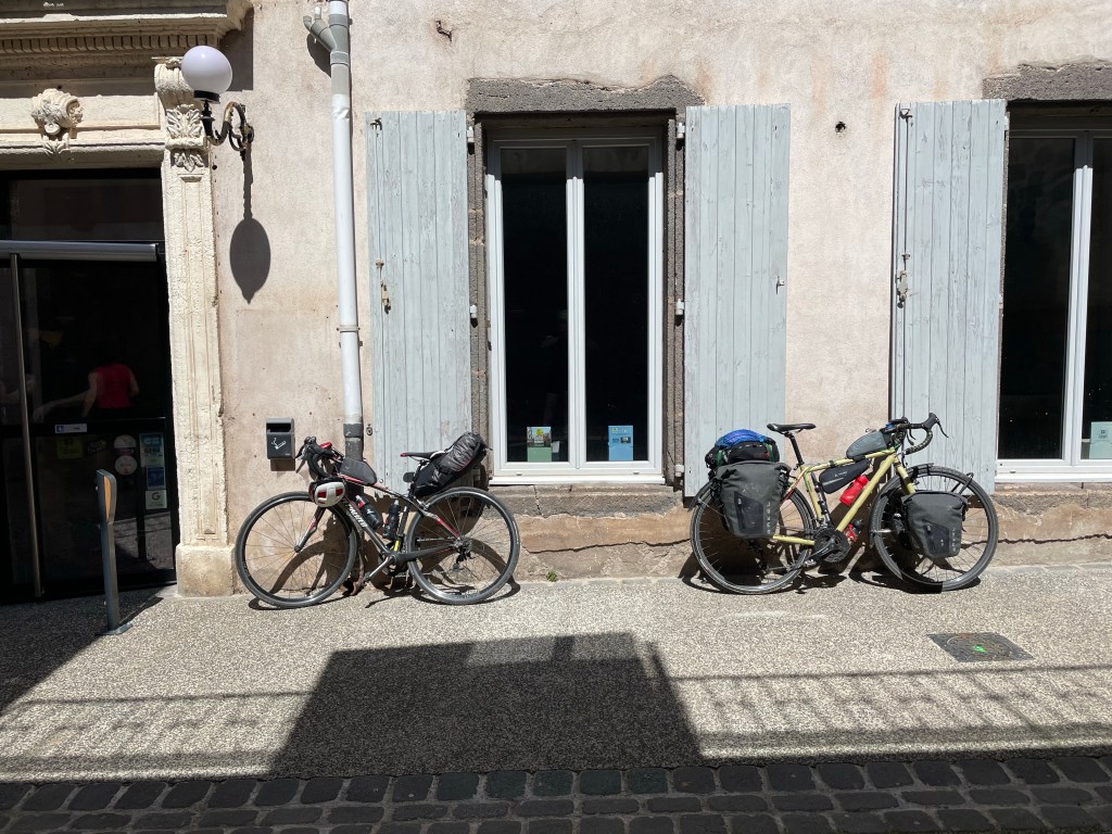 Après le petit déjeuner, je vais chercher les vélos pour constater que mon pneu arrière est complètement dégonflé. On s’y attendait et notre premier arrêt prévu est à la boutique Mondovélo de Narbonne.