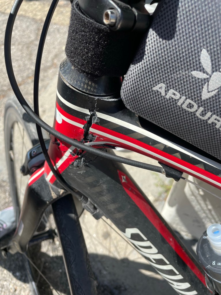 Son vélo est cassé sévèrement là où s’introduit la tige de fourche. Impossible de continuer avec ça.