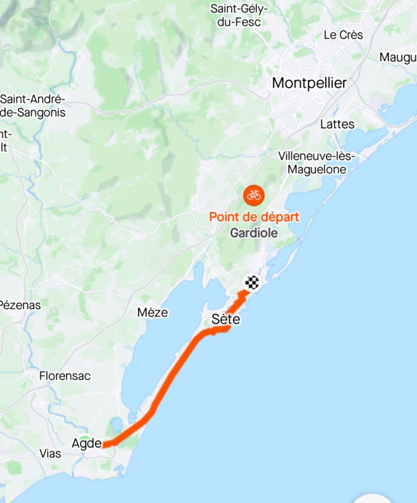La section en ligne droite, entre l’étang de Thau et la mer, est roulée à plus de 33 km/h; tout va comme sur des roulettes.