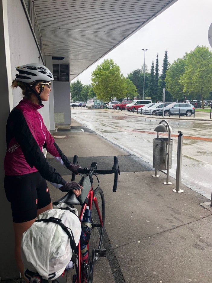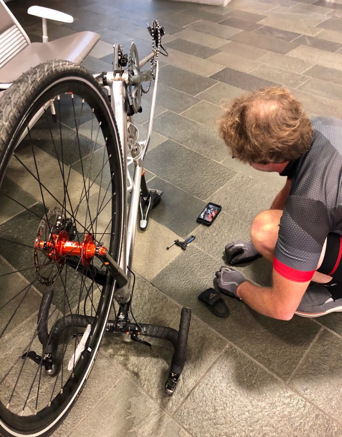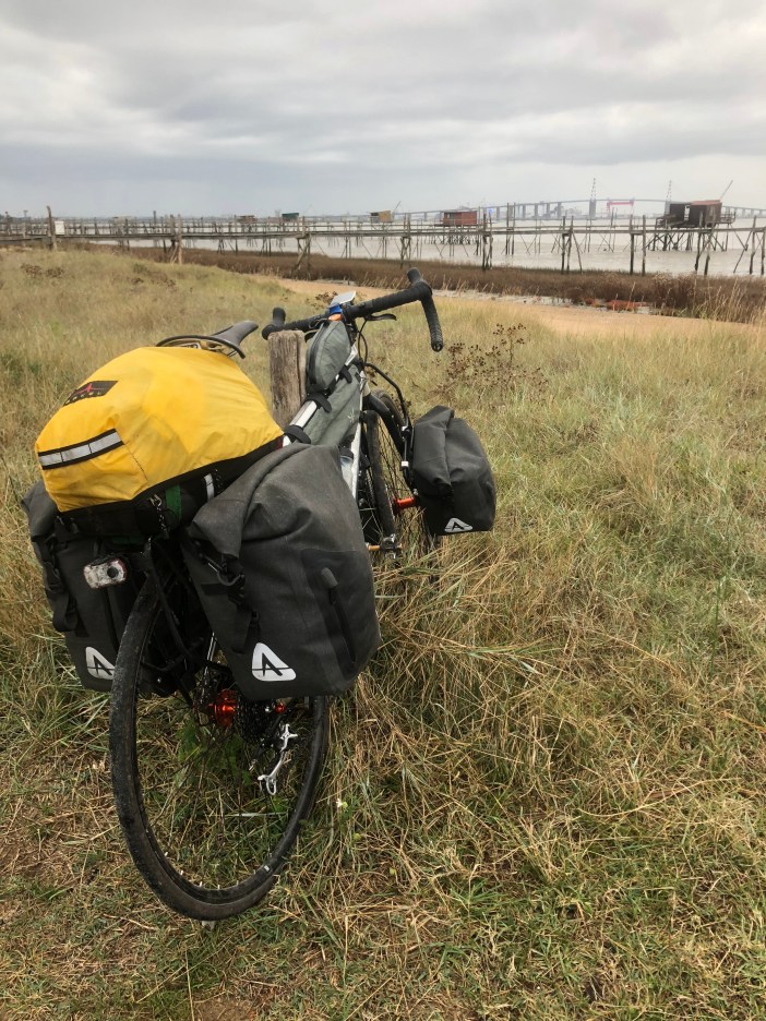 Juste avant de partir, je m’assure de délester mon vélo pour ne prendre qu’une petite valise avec de quoi faire des réparations de vélo et des manteaux pour la descente.