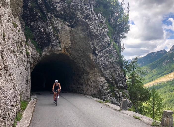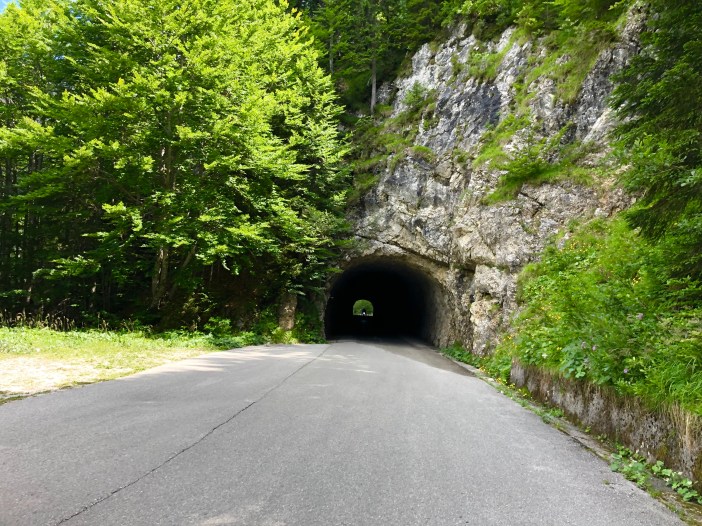 Plus près du sommet, nous devons passer dans quelques tunnels sombres, creusés dans le calcaire. On tente d’y éviter la rencontre de voitures parce que même avec nos lumières, on s’y sent très vulnérables.